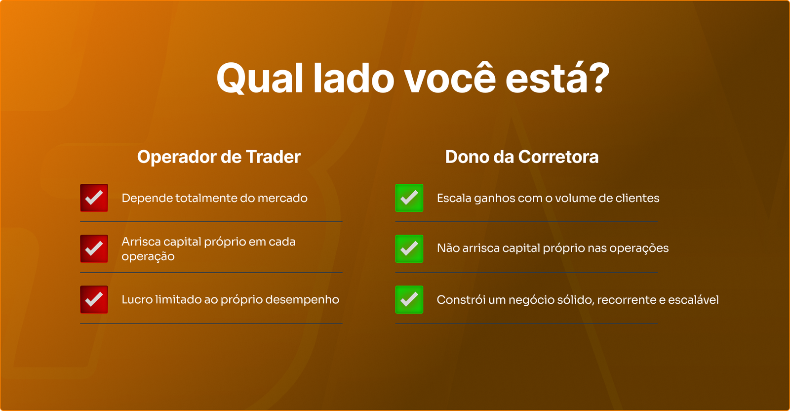 Enquanto milhares brigam para ganhar em uma única operação, você pode ter sua própria corretora e transformar o mercado em sua fonte recorrente.